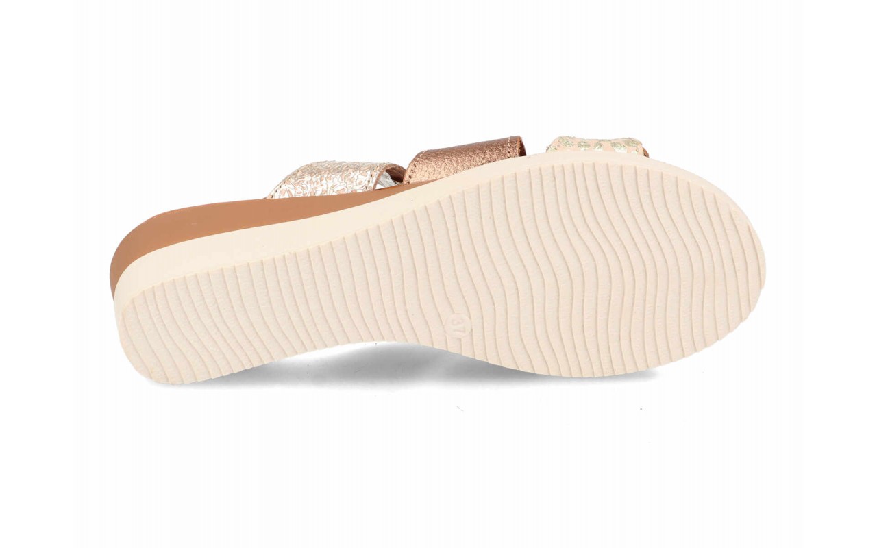 Sandalia de piel cómoda para mujer modelo 135 color cuero y oro rosado con cuña y planta de gel – Fabricada en España