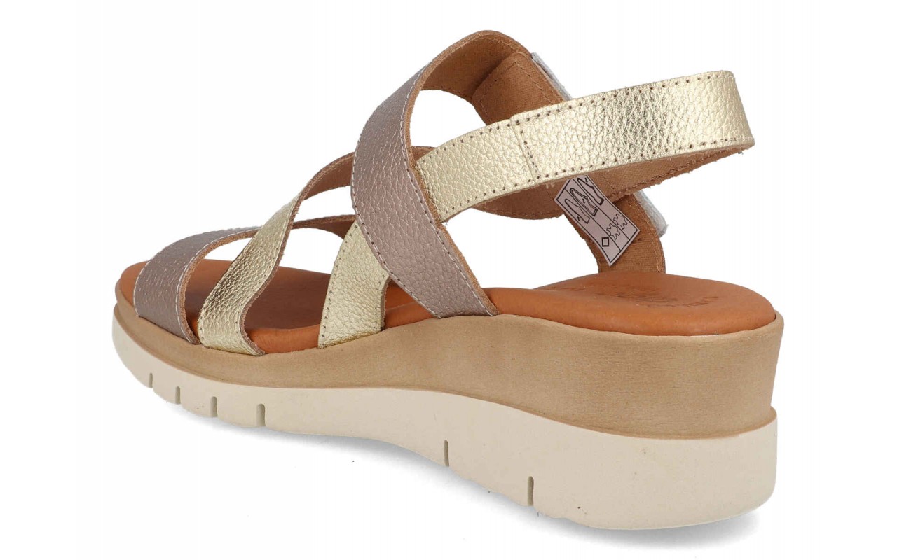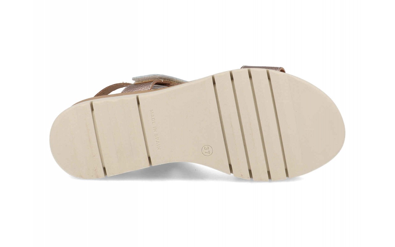 La sandalia incorpora una cuña ligera y estable, que aporta una pequeña elevación muy cómoda sin comprometer la estabilidad. Esta cuña estiliza la figura y favorece una postura más natural al caminar, manteniendo siempre una pisada equilibrada y segura.