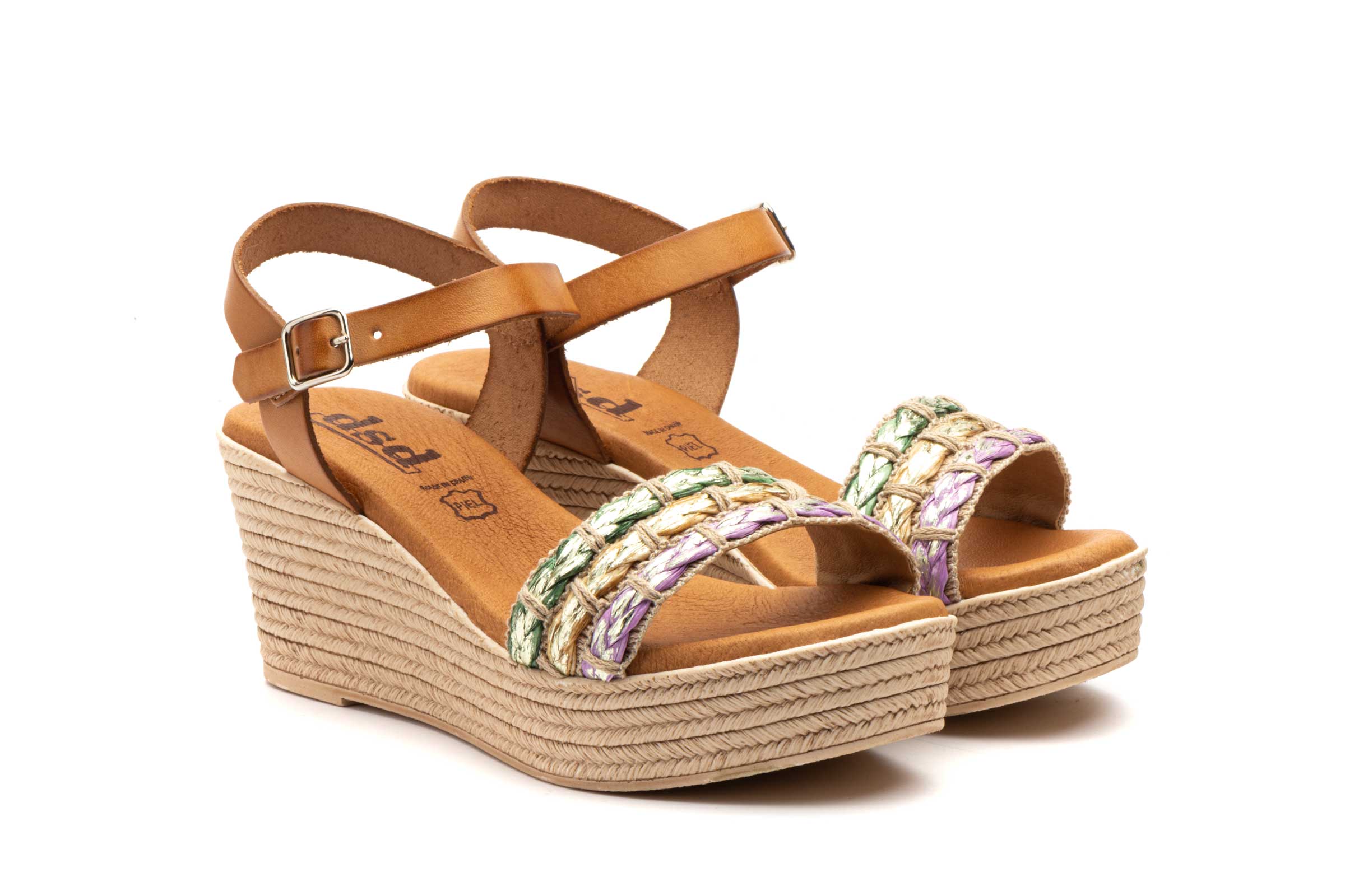 El modelo incorpora una pala frontal decorada con un trenzado multicolor que aporta un toque original al diseño. Este detalle decorativo añade personalidad al calzado y convierte a la sandalia cuña mujer planta gel 10035 en una opción muy atractiva para quienes buscan una sandalia cómoda sin renunciar al estilo.