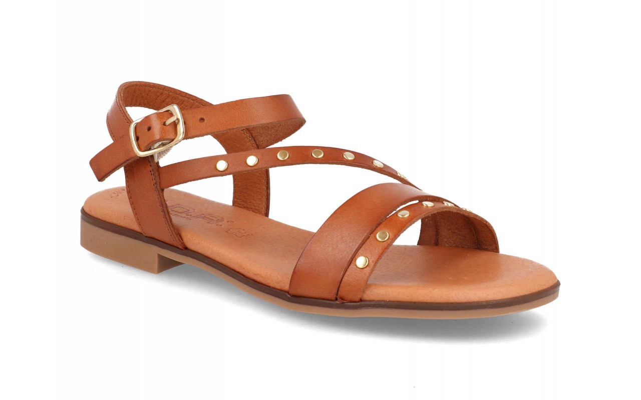 El diseño de las sandalia señora piel modelo 3079 se caracteriza por su estructura de tiras que sujetan el pie de forma equilibrada. La tira delantera proporciona estabilidad en la pisada, mientras que la tira central decorada con pequeñas tachas metálicas añade un detalle visual que eleva el diseño sin resultar excesivo.